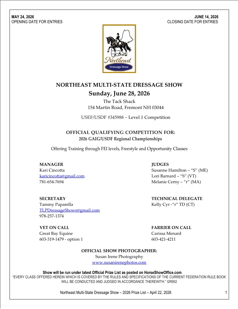 USDF L Education Program ~ 2026 Part 2 - Candidate?s Evaluation and Testing Application 03/07/26 - 8/16/2026 Online Registration has closed for this event NEDA Nightcheck (May) 05/21/26 - 5/21/2026 register for this event... NEDA Nightcheck (June) 06/18/26 - 6/18/2026 register for this event... NEDA Nightcheck (July) 07/16/26 - 7/16/2026 register for this event... NEDA Nightcheck (Aug) 08/20/26 - 8/20/2026 register for this event... NEDA Nightcheck (Sept) 09/17/26 - 9/17/2026 register for this event... NEDA Nightcheck (Oct) 10/15/26 - 10/15/2026 register for this event... 2026 Absorbine / NEDA Symposium w/ Jan Brink 10/17/26 - 10/18/2026 Registration is Coming Soon for this event |
